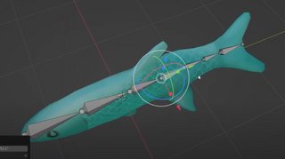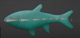 Выделим арматуру, нажмем "Shift" + "S" -> Selection to cursor. Теперь наша арматура переместилась ровно в центр анимируемого объекта. Можем добавлять новые косточки, перемещать эти косточки и подготавливать их к дальнейшей трансформации. Переместим эту косточку в голову рыбы и немного поднимем, чтобы она была ровно посредине. После чего мы можем добавлять новые кости. Делаем это в режиме редактирования, выделяя конец нашей кости и нажимая "E". Качество детализации анимации зависит от количества костей. Чем больше будет косточек, тем больше деталей движения можно контролировать (Рис. 2).