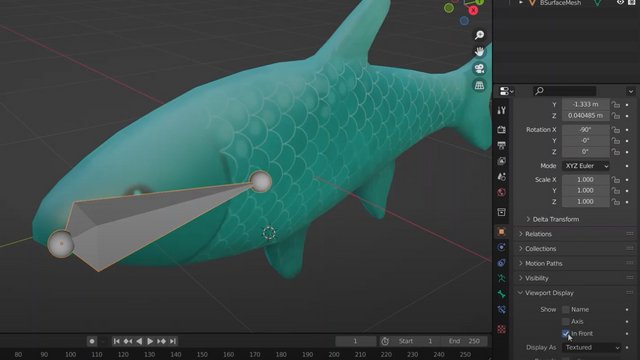 Добавим арматуру на нашу рыбку для анимации хвоста. Повернем нашу арматуру так, чтобы она была направлена также, как рыба. Перенесем ее в начало нашей рыбки. Очень часто наша арматура находится внутри объекта, тогда ее части плохо видно. Заходим в меню свойств объекта, в настройки Viewport Display и ставим галочку In Front (Рис.1).