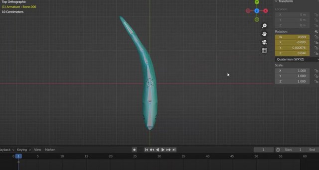 Начнем создавать анимацию. Нажмем на цифру 7 на NumPad, чтобы видеть нашу рыбку сверху. Откроем N-панель, чтобы видеть все наши трансформации. Работать мы будем только с хвостовой частью рыбки. Анимация будет создаваться последними пятью косточками.