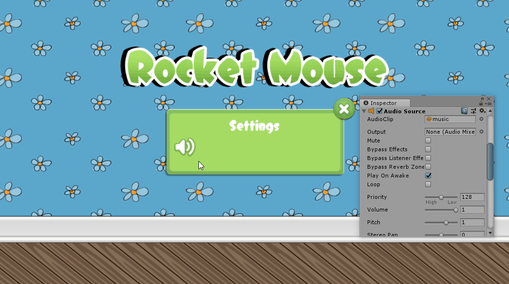 В иерархии вам необходимо выбрать «Основная камера» и добавить компонент «Источник звука». Затем в окне «Проект» откройте RocketMouse ⇒ «Аудио» и перетащите значение «Музыка» в поле «Аудиоклип» в Инспекторе.