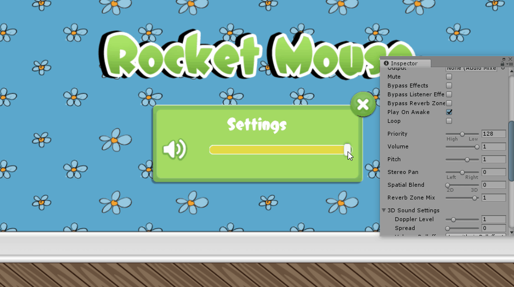 Снова сохраните проект (Файл ⇒ Сохранить) и запустите воспроизведение сцены. Теперь в настройках меню громкости вы можете изменять громкость звуков и музыки.