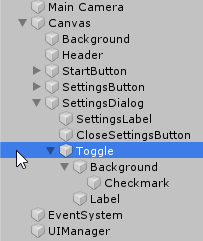 Для того чтобы добавить эту функцию нужно щелкнуть правой кнопкой мыши на SettingsDialog и выбрать UI og Toggle, чтобы добавить переключаемый элемент UI в качестве дополнительного элемента диалога.