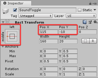 Теперь измените анкор SoundToggle в Иерархии с X=115 и Y=-10.
