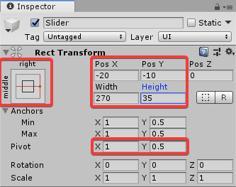 В иерархии выбираем VolumeSlider и устанавливаем его анкор в середине правой стороны, также устанавливаем Pivot на (1, 0,5). Наконец, установите его RectTransform X=-20, Y=-10, ширина: 270, Высота: 35.