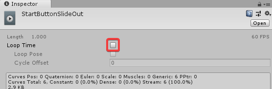Для начала выключите меню воспроизведения анимации, чтобы кнопка перестала перемещаться по рабочей области. Для того чтобы отключить зацикливание, откройте пункт «Animations» в окне проекта и выберите анимацию StartButtonSlideOut. На панели управления снимите флажок «Loop Time».