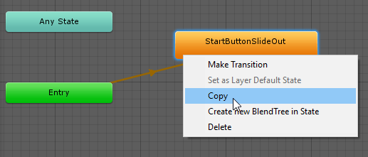 Затем в иерархии выберите «StartButton» и откройте меню «Аниматора», выбрав Окно ⇒ Анимация ⇒ Аниматор. Выбирайте функцию «копировать» при помощи щелчка правой кнопки мыши по анимации StartButtonSlideOut.