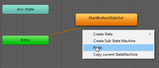 Наконец, вам предстоит добавить несколько переходов между двумя состояниями кнопок. Для этого щелкните правой кнопкой мыши состояние StartButtonSlideOut и выберите «Сделать переход». Затем нажмите на StartButtonSlideIn, чтобы сделать переход.