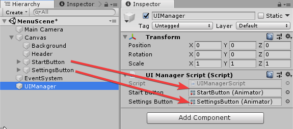 Находясь в программе, выберите в иерархии UIManager и перетащите кнопкой мышки StartButton в поле ввода «Start Button». Таким же образом переместите SettingsButton в поле «Settings Button».