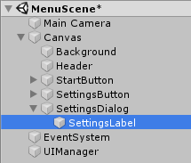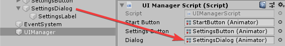 Далее сохраните UIManagerScript в текстовом редакторе и переключитесь обратно в редактор Unity. В иерархии вам нужно выбрать UIManager и переместить SettingsDialog в соответствующее поле в Инспекторе.