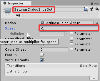 В иерархии вам нужно выбрать SettingsDialog и открыть меню Animator. Скопируйте и вставьте в поле значение SettingsDialogSlideIn. Переименуйте дубликат в SettlingsDialogSlideOut и установите для него значение скорость=-1.
