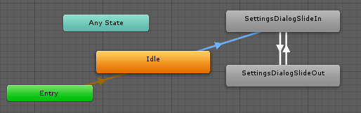 В инспекторе создайте подпункт Idle, после чего создайте для него состояние слоя по умолчанию и сделайте два перехода между Idle и SettingsDialogSlideIn. По условию isHidden имеет значение false.