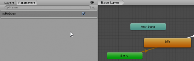 Теперь нужно создать два перехода между состояниями анимации, как вы это делали ранее. Для этого добавьте параметр isHidden типа bool.