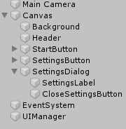 Создайте новую кнопку как дополнительный элемент SettingsDialog, щелкнув правой кнопкой мыши в меню иерархии и выбрав UI ⇒ Button. Эту кнопку необходимо переименовать в CloseSettingsButton. Обратите внимание, что на этой кнопке не будет текста, поэтому необходимо удалить объект Text, вложенный в CloseSettingsButton.