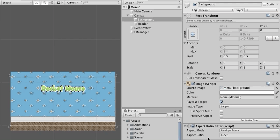 Он автоматически установит значение Aspect Ratio в текущее положение Rect Transform изображения. Теперь переключитесь на «Envelope Parent» чтобы снова изменить изображение. Теперь оно должно заполнять весь экран.