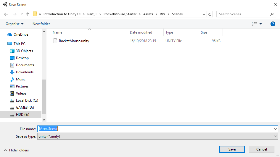 Лучше всего сразу сохранить результат. Откройте «Файл» ⇒ «Сохранить сцены». Затем введите «MenuScene» в качестве названия файла и сохраните его в папке RW / Scenes, рядом с файлом «RocketMouse».