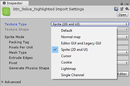 Прежде чем вы сможете использовать изображение, вам нужно установить параметры для девяти зон. Для этого вам нужно открыть папку «Меню» в окне «Проект» и выбрать изображение «btn_9slice_normal». В настройках импорта инспектора установите для параметра «Тип текстуры» значение «Спрайт» (2D и пользовательский интерфейс) и нажмите «применить изменения». Затем нажмите кнопку «Редактор Sprite», чтобы открылось новое меню.