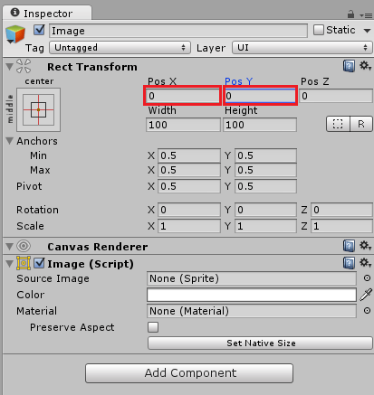Внимание: Важно понимать, что положение элемента пользовательского интерфейса устанавливается в зависимости от анкоров. Положение (0, 0) означает расстояние от анкоров, которые установлены в верхнем левом углу сцены.