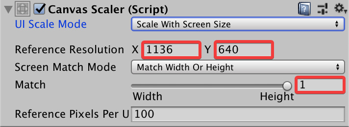 Вам нужно изменить режим компонента для масштабирования «Scale With Screen Size» и установить его координаты X: 1136, Y: 640. Также увеличьте значения ширины и высоты, сдвинув ползунок максимально вправо.