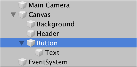 Теперь, когда ваша игра имеет красивый фон с надписью, пришло время добавить несколько кнопок. Для этого в верхней панели выберите GameObject ⇒ UI ⇒ Button, чтобы добавить на сцену новую кнопку. В иерархии этот объект также должен иметь дополнительный элемент Text.